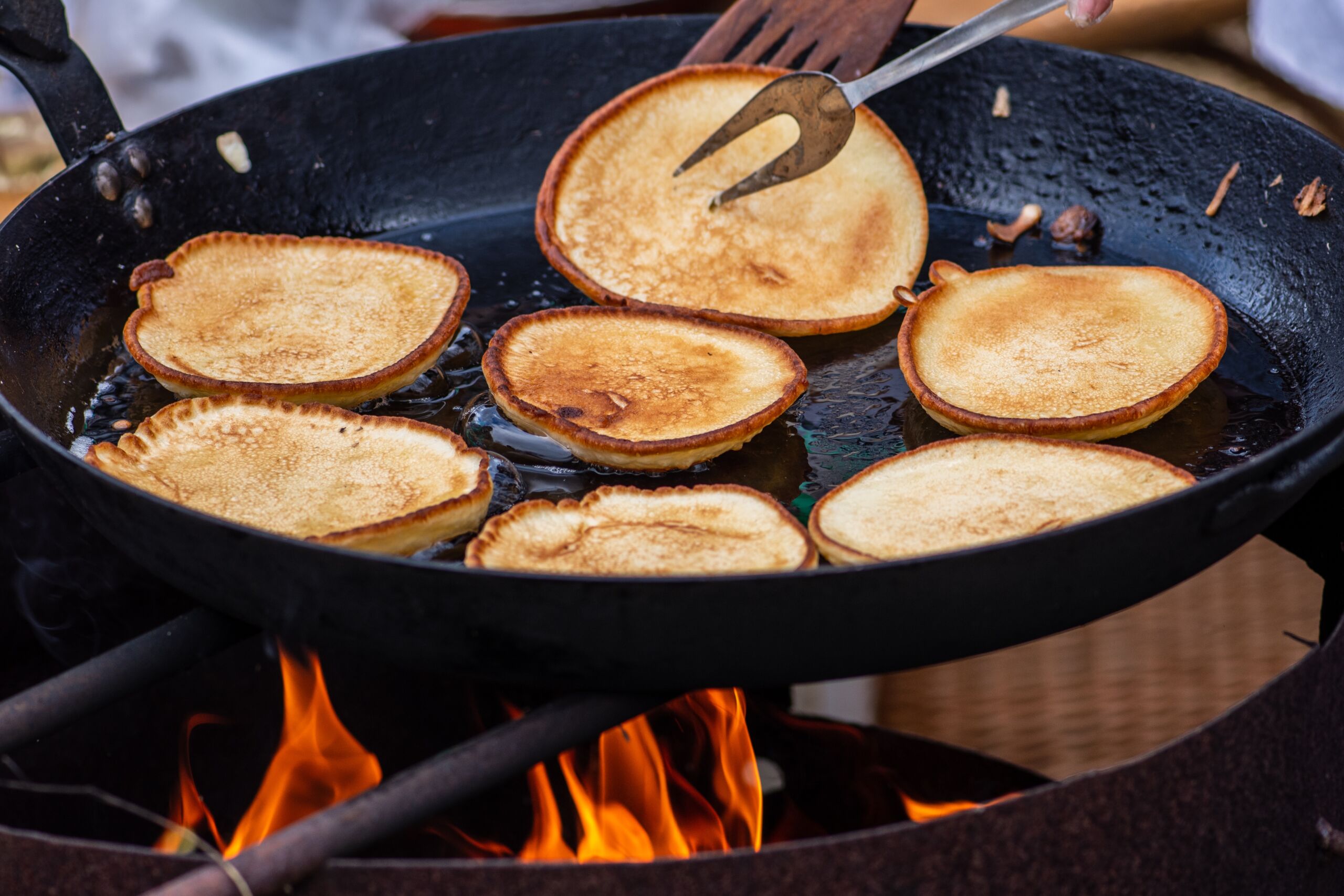 - Įkaitinkite keptuvę, įpilkite šlakelį aliejaus, kad blynai neliptų.