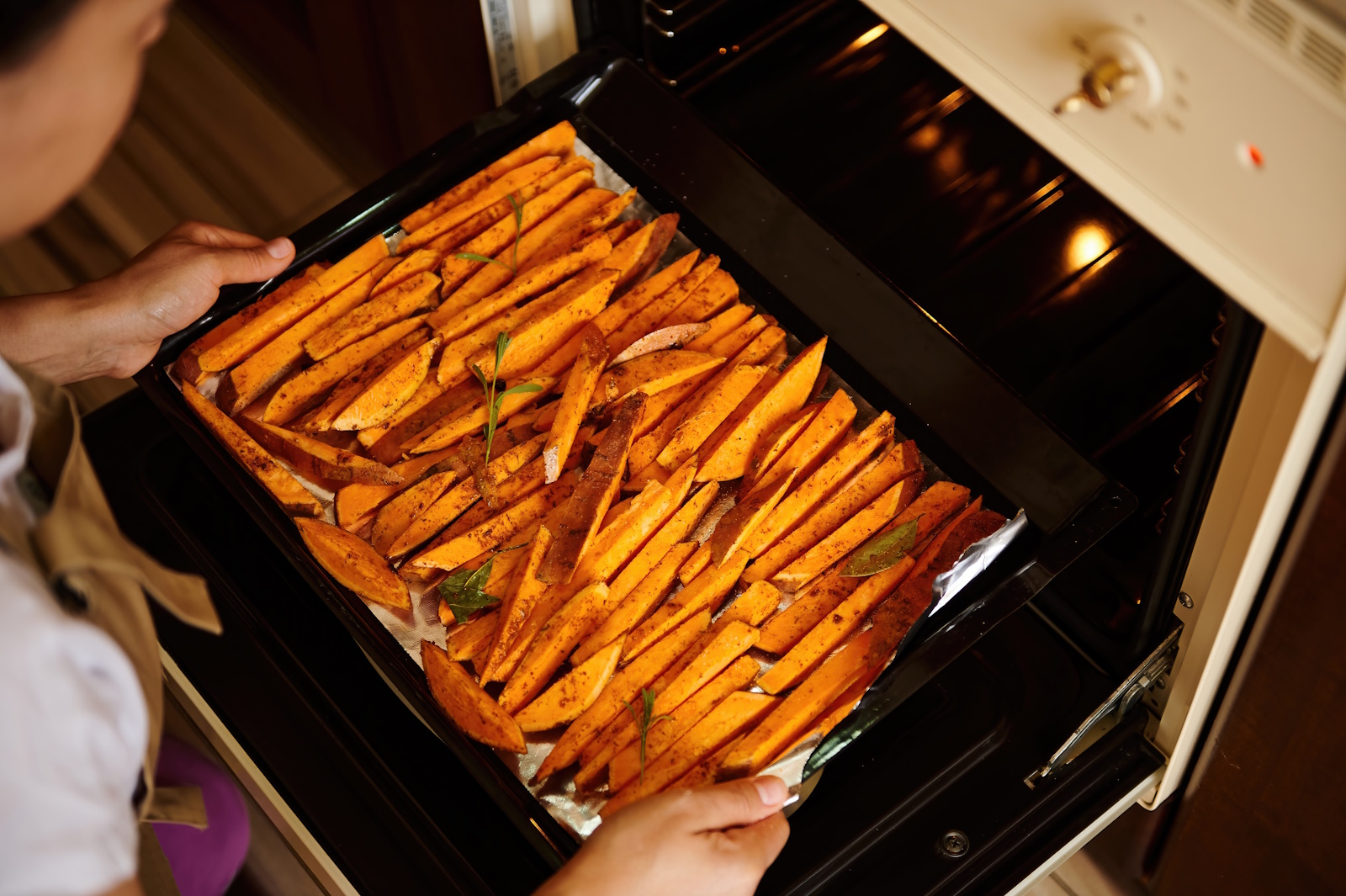 - Naudokite aukštą kepimo temperatūrą, kad batatai išorėje būtų traškūs.