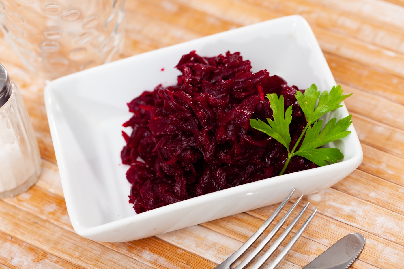 - Pagardinkite. Sudėkite burokėlius į dubenį, įberkite druskos, pipirų, išspauskite česnako (jei naudojate).