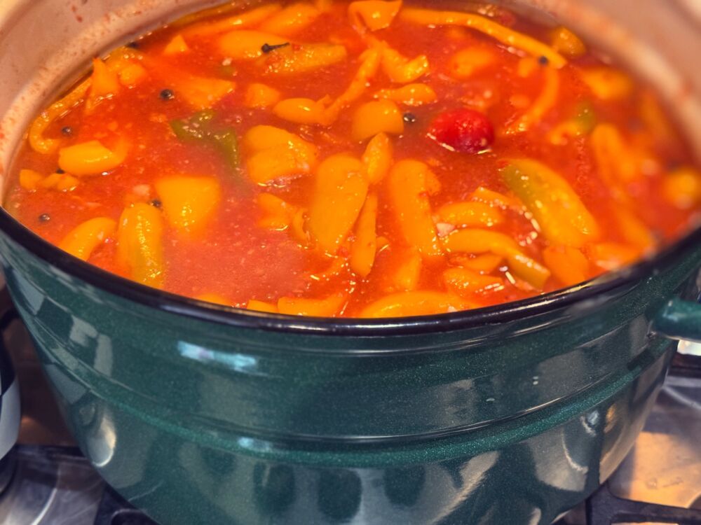 Kai pomidorų masė užvirs, suberkite nusausintas paprikas. - Virkite.